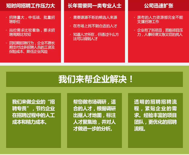 服务优势成本低,操作时间短短时间提供大量的候选人面试,提高招聘效率,节约企业的时间成本及人工成本服务费用较猎头服务低,在保证签约数量的同时降低公司人员招聘成本
